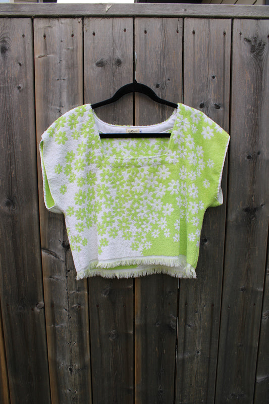 Vintage Towel Blouse -Green Daisy Floral Square Neck Shirt (S)