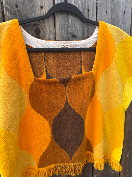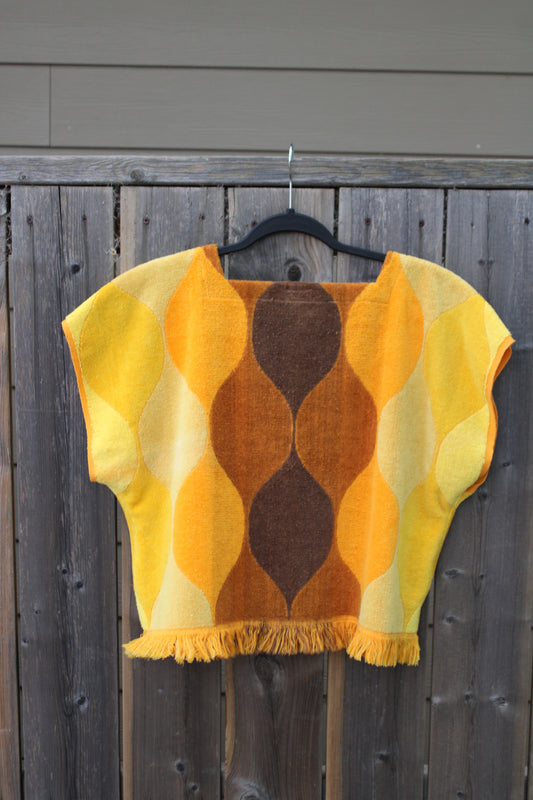Vintage Towel Blouse (XL) - 70s Orange, Yellow and Brown Square Neck Shirt