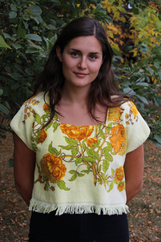 Vintage Towel Blouse (L) - Orange, Brown and Yellow Florals