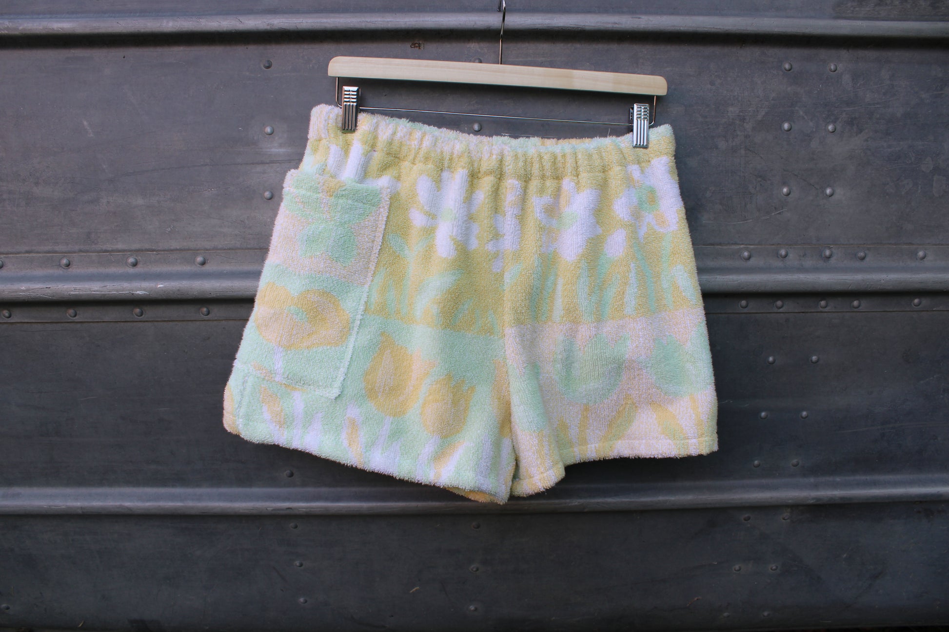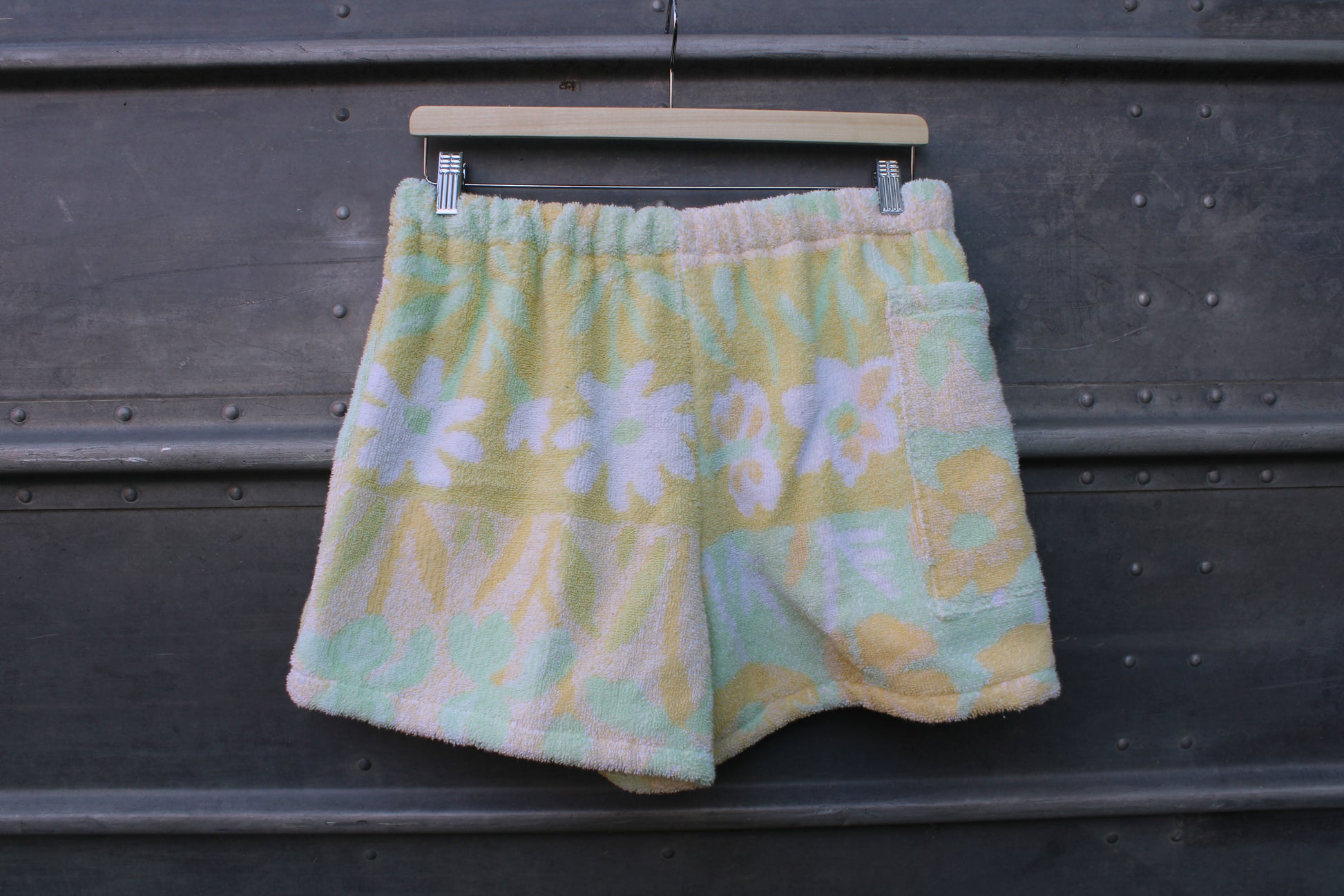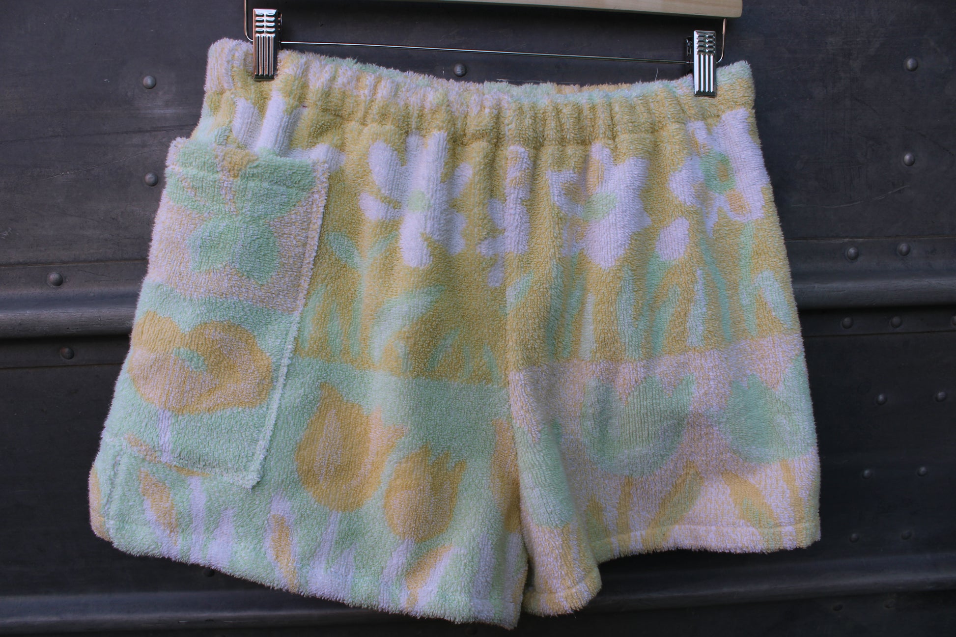 Shorts made from a vintage towel (cotton). Mid rise and perfect for a beach or swimsuit coverup - or just to wear everyday.