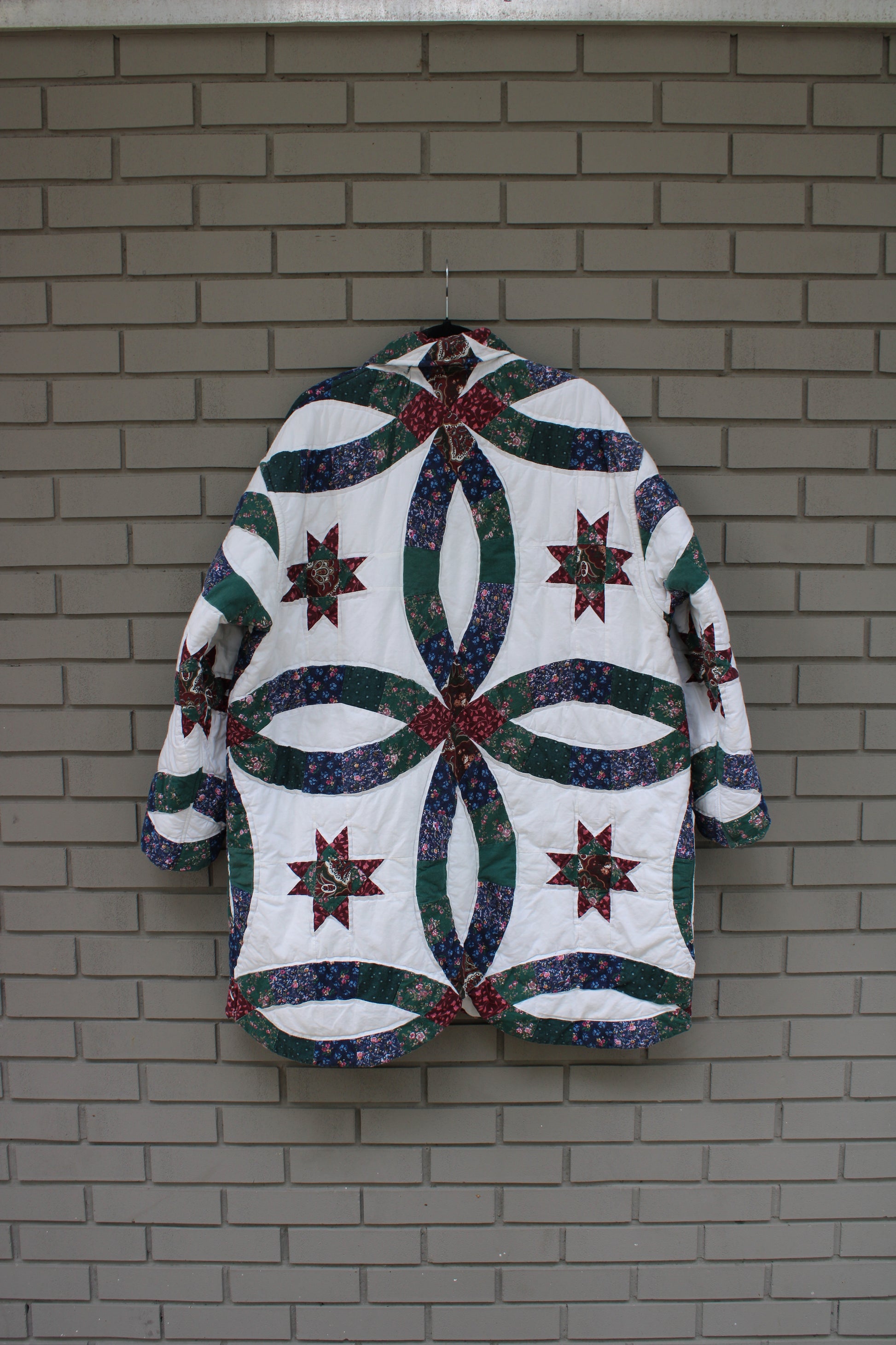 This one of a kind jacket is handmade with love from a vintage double wedding ring built. The quilt was machine pieced and hand quilted. The colours rand from burgundy, green and navy on a white background.