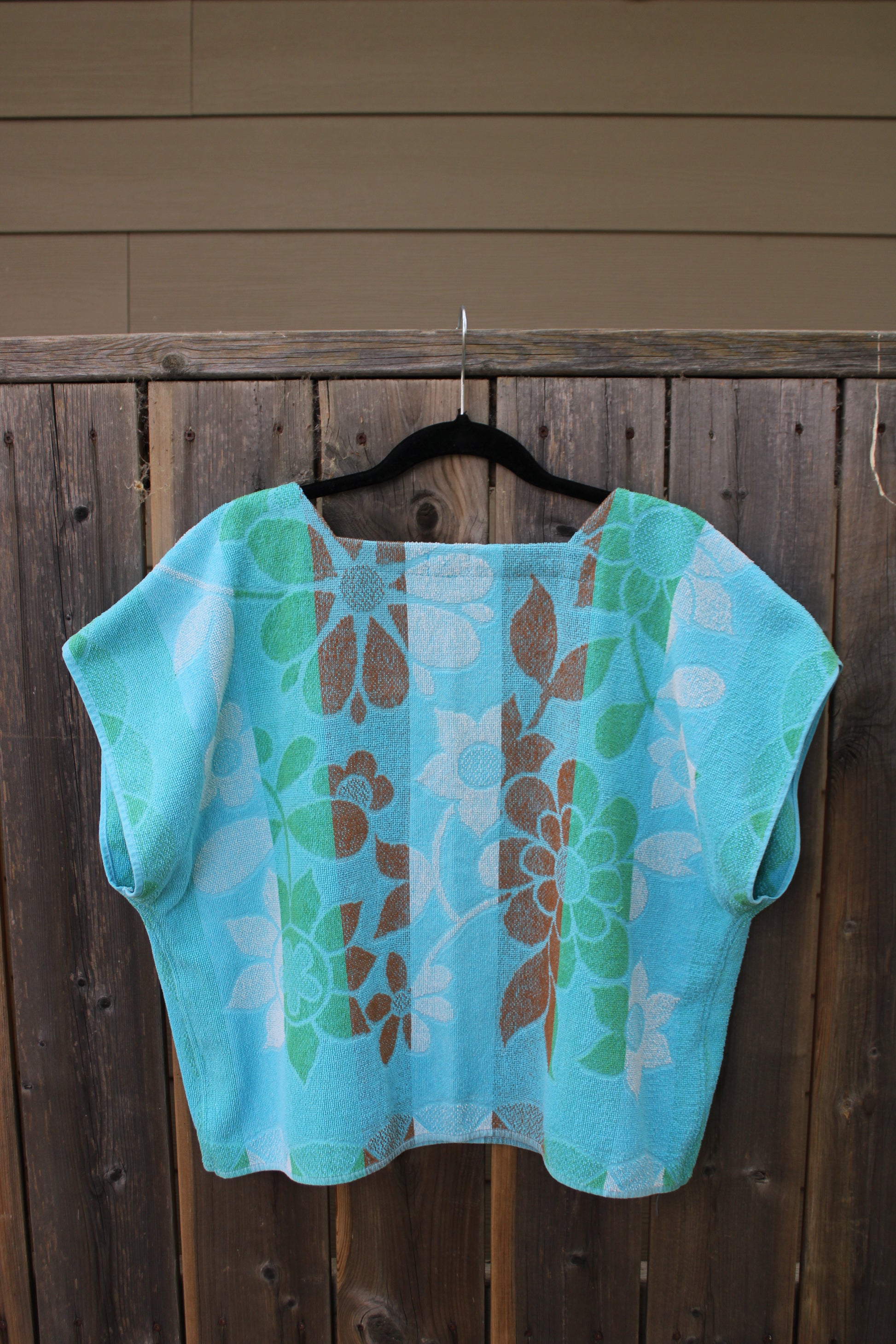This top is made from a vintage cotton towel in a bright blue background fabric with green, brown and white accents with all over floral motifs.